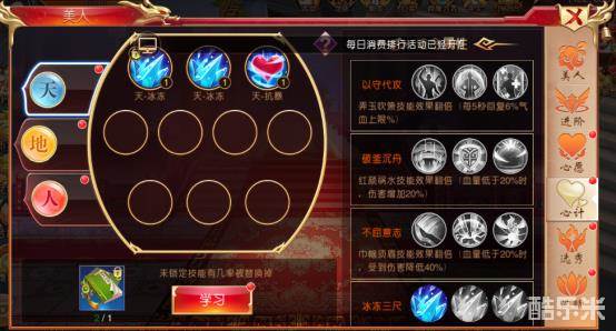 特定等级开启技能格子后,才有可能学习到新技能。已学习的技能可以通过高级技能书升级,如1级技能使用2级心计技能书升到2级,达到一定条件可激活组合属性,如天地人分别激活某一个特定技能或者天地人分区激活技能数量达到特定要求。