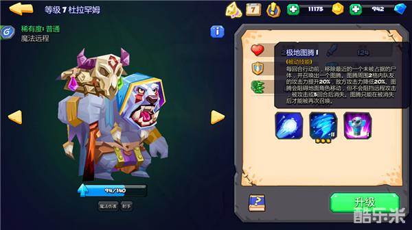 超高的血量让她完全可以作为先发阵容登场,而且49的速度,在远程中仅次于小魔女的54速,很多时候可以抢到先手权。而且被动技能极地图腾的效果惊人,可以提高我方速度与伤害能力,同时降低敌方速度与伤害能力,作为辅助来说,这个技能完美。