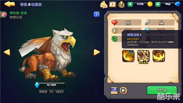 狮鹫身为游戏第一高速,是一张性价比极高的卡牌。在狮鹫12级时,可获得25%的命中加成,让狮鹫在面对有着闪避技能的单位时,有着稳定的输出能力,减少意外发生。但是较少的血量和普通的防御让玩家在使用狮鹫时要多注意出场位置和行动后的落脚点位置。狮鹫第一回合的被动技能狮鹫颂歌对于队友的提升不可小视,极为容易让己方阵容在第一回合连续抢占先手。无限反击的特性也会让对手的近战卡牌在攻击狮鹫前好好考虑一番。