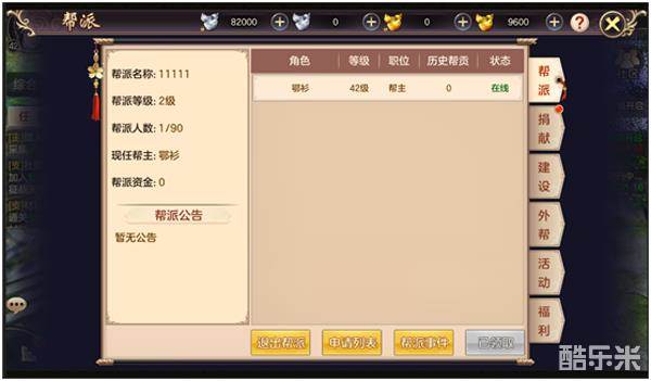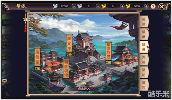 帮派建设共有4个建筑,分别是:聚义厅、技能堂、帮派商店、帮派领地;