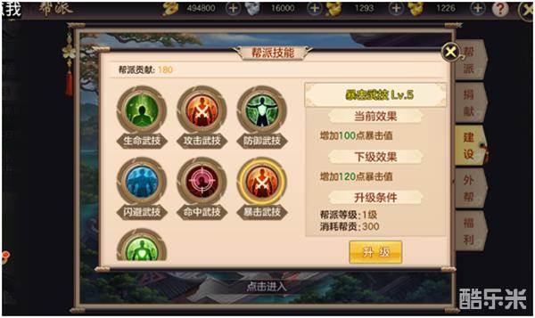 技能堂:随聚义厅的等级对应提升,技能堂等级越高,可升级的帮派技能越高级,最高可升至100级,升级帮派技能可大量提升角色属性值。