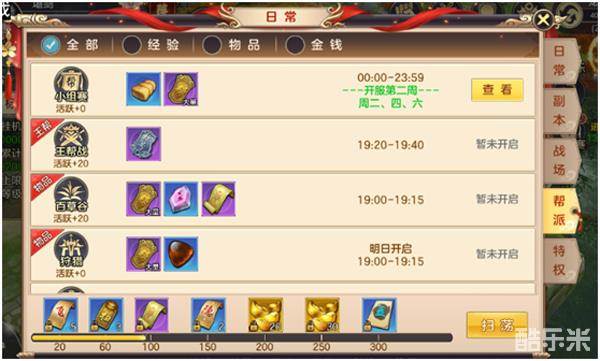 而帮派主要获得奖励的绝对是各种帮派活动,参与各个活动,可以获得大量的帮贡、各种宝石、进阶材料和实用消耗道具,能给少侠带来不菲的战力加成,所以帮派活动一定要记得准时参与哦!