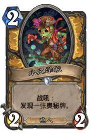 2费2/2站场能力并不好,会被硬壳甲虫等2/3白吃,但是谁TM看到对手下甲虫还下水文学家送呢?对手下甲虫,我们肯定下阿曼尼啊,所以身材劣势pass,我们看中的是它的效果,发现的奥秘相对比较稳定,能找到当前对于我们有利的奥秘,并且起到干扰对手节奏的作用,特别是救赎之类的卡,复活个巫妖王弗丁简直不要太爽。