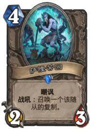 这张卡除了是2个嘲讽能挡2个攻击频率以外,它的高频率也是对巫妖王某buff+2/2和魔免的加强,多一个频率就赚一次buff,而最大的好处在于他是分裂,当橙武亡语buff到它的时候,2个萨里苦囚都可以装备橙武,平白无故赚了一把橙武,基本这个combo成功之后,橙武就无法无天了,不过此combo仅仅是添头,随缘就好。