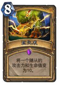 8费使一个随从变成10/10,这张卡2个用法,其一是场面进入大后期的疲软阶段,双方都拿不出什么伤害,这时候变一波10/10,对手处理不了就完,处理得了我们完。另一个则是作为斩杀之用,我们有风怒鹰身人,如果活下来了,buff一波,一回合20血,伤害爆炸。当然还能buff嘲讽随从苟活,用法多样,不过因为费用过高,所以仅带一张。