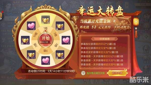 【活动内容】当日内累计充值达到要求即可获赠抽奖次数,每次抽奖可获得最高10倍奖励(抽奖次数每日重置)。