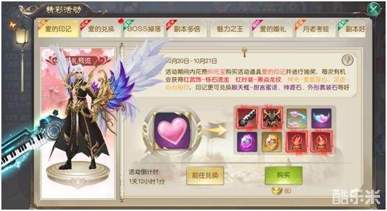 【活动内容】活动期间内花费80元宝购买活动道具爱的印记并进行抽奖,每次有机会获得红武饰-铄石流金、红时装-黑焱龙纹、神光-爱箭穿心、足迹-心心相印,印记更可兑换聊天框-甜言蜜语、神源石、外形套装石等好礼!