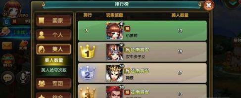 《天将传》中存在国家、个人、美人、军团、综合五大排行榜,每个排行榜各有特色,下面就为主公大人们详细介绍一下哦。