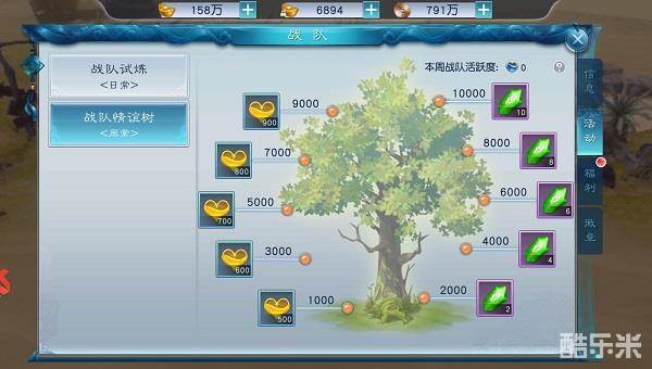 打开【战队】-【活动】界面可以查看战队日常任务,完成可获得情谊值和战队活跃度,累积活跃度和情谊值可以在战队情谊树中获得丰厚的奖励。