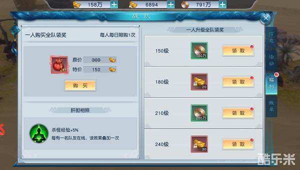 打开【战队】-【福利】界面可以查看战队福利了。战队礼包一人购买全队领奖,战队一人升级全队领奖,战队每多一个人在线,增加5%的杀怪经验。这些福利是不是非常丰厚呢?