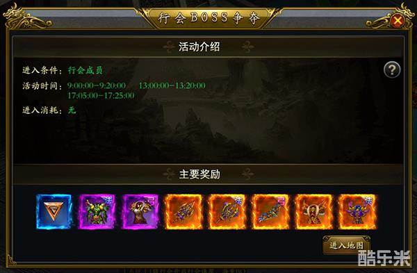 行会BOSS活动每日定时开启,开启时间参考精彩活动-定时活动界面,每次活动持续20分钟,击杀10只行会BOSS可获得大量装备奖励,掉落装备不绑定,大家都可拾取,记得把敌人清掉再安心打BOSS!
