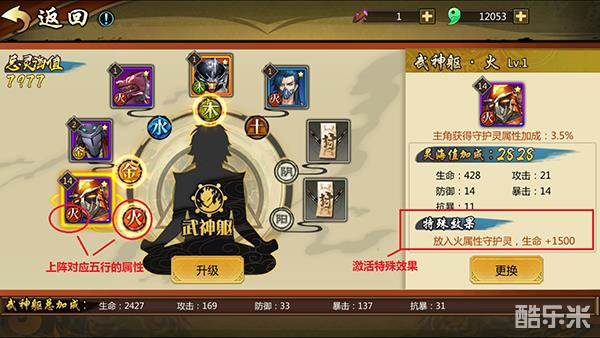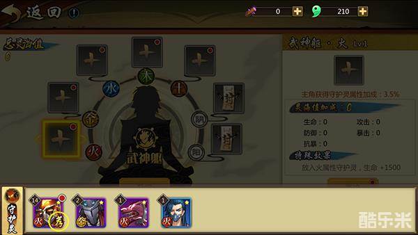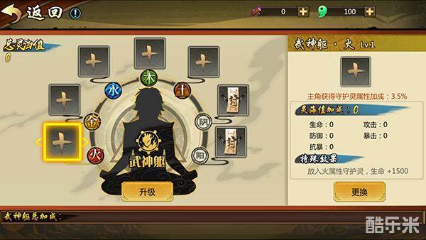 武神躯槽位分为金、木、水、火、土、阴、阳共七个槽位,在槽位中上阵对应五行属性的守护灵就能获得额外特殊效果的属性加成,阴和阳两个槽位上阵任何守护灵都会获得特殊效果加成。