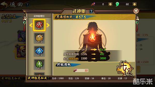 点击武神躯的升级按钮就会进入到我们升级界面中,在这里我们可以查看各个槽位的等级、属性和灵海值加成等信息。升级槽位需要消耗“灵槐枝”大家可以通过圣灵挑战、商店、宝藏和VIP礼包等玩法获得。每个槽位升级越高,转化守护灵属性到账号上的比例和特殊效果属性加成就越高噢。