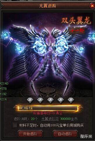 《魔龙诀》中最新推出一个进阶钻石系统,以后进阶不用一次过顶满整条进阶槽了,可以慢慢地进阶,并提前享受部分的进阶效能哦!这么赞的方法是最近更新才有,并且限定为10阶后的光翼和坐骑才能启动。