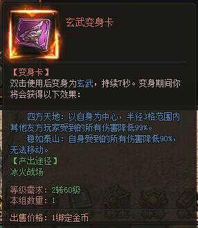 玄武变身卡更适用与战场,特别是跨服战场。这种卡跟其他变身卡一样,冰火战场内使用只要花费800精铁就能买到。个人觉得没必要买场外的,因为它的技能是守护自己与队友的。如果在战场中你能短暂无敌,那么你在交火的第一下就能灭对方团,弄个大局已定也是可以的~ 一张卡改变一场战斗的走势,这是多么值得的呀!