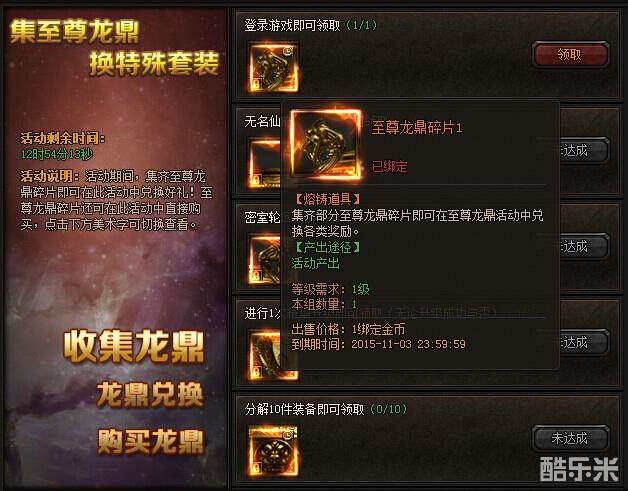 分解10件装备即可领取(0/10):至尊龙鼎碎片5