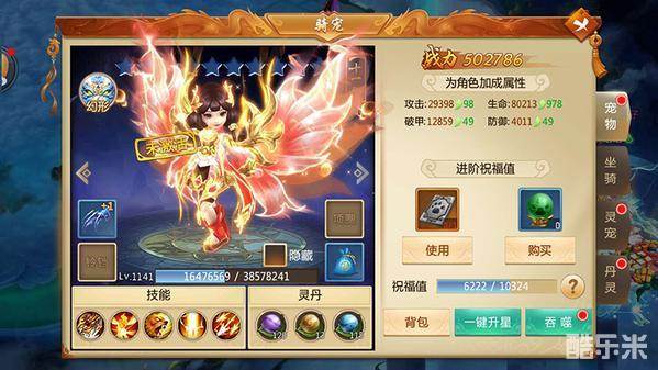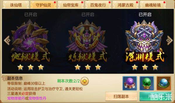 灵宠不仅中看,还很中用。灵宠有自己的阶级和等级,通过提高阶级和宠物等级就能使玩家的战力提升,所以培养灵宠也是游戏中很重要的一环。宠物头上有星级,当星升满了之后宠物就能进阶到下一阶段。进阶最常用到的道具“宠物进阶丹”可以在商城购买、任务奖励或者通过副本“守护仙灵”获得。在副本“守护仙灵”中除了宠物进阶丹,还能获取增强宠物能力的宠物潜能丹和宠物悟性丹。吞噬装备则是通过把不需要的装备喂给宠物来提升宠物等级,切记不要手滑喂掉有用的装备就好。