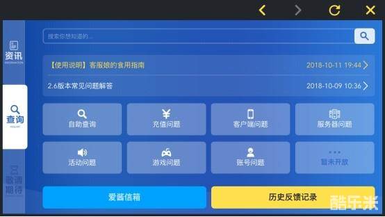 在查询页面,舰长还可以查看常见问题和解答。(包括:充值问题、客户端问题、服务器问题、活动问题和账号问题。)