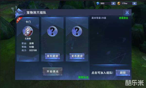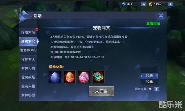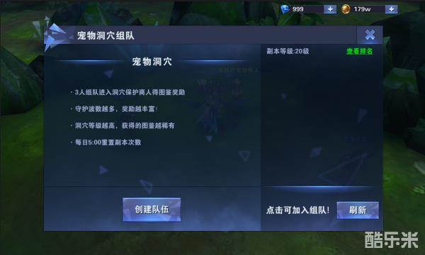 当我们升到20级后就可以组队参加宠物洞穴副本了,每人每天只有一次进入副本的机会,如果您有足够的钻石,就可以再购买一次进入机会。