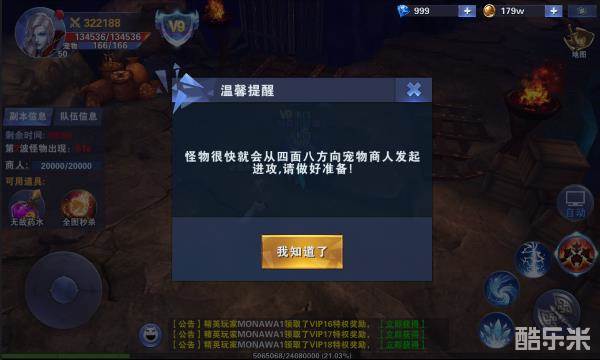 进入副本后,会有大量怪物按照波次刷新出来,它们会攻击地图中的宠物商人。我们的任务就是保护宠物商人,并且击杀怪物。