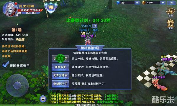 当我们选中宠物后,就可以点击左边的“跟随参赛选手”陪伴宠物一起跑向终点。在四场比赛中,如果我们选中的宠物胜利次数越多,我们最终获得的奖励就越丰厚,因此想一试手气的小伙伴们要记得准时参加每晚六点的宠物快跑活动哦!