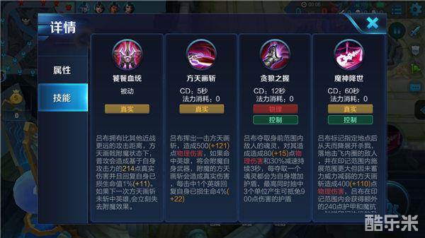 三技能是吕布的开团技能,控制效果非常好,而且吕布在大招的印记范围内还能够具有额外的双抗加成。大招为可选择位置释放的技能,具有一定的位移能力,如果被敌方集火时,可以开启大招进行躲避,在吕布释放大招飞向天空和落下的那段时间是无敌的,攻击是没有办法被选中的。大招的范围比较大,当敌方有英雄触碰到大招的边缘时,还能为吕布回复生命,增加了其生存能力。