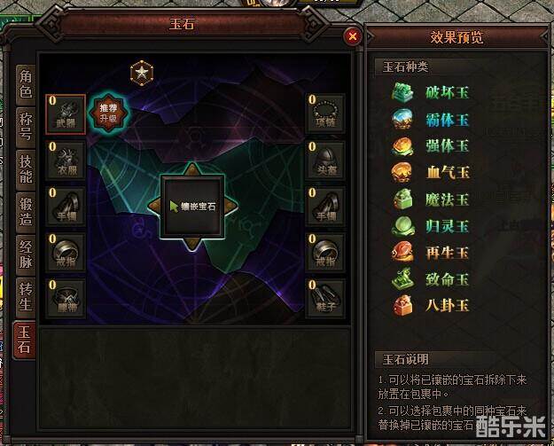 玉石界面在“人物-玉石”当中可以看到。玩家可以将已镶嵌的宝石拆除下来放置在包裹中,也可以选择包裹中的同种宝石来替换掉已镶嵌的宝石。另外对于玉石的购买渠道也有很多: