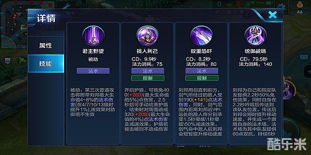 一技能“损人利己”,开启护盾,可抵免400/520/640/760/880/1000(+168)(最大生命值的5%)点伤害,2.5秒后可手动结束护盾,结束时对周围造成320/416/512/608/704/800(+134)(最大生命值的4%)点法术伤害及减速效果。护盾若被击破则不造成伤害。该技能给自己一个强大的护盾,并且能在2.5秒后手动结束,结束时能对周围敌人造成较高的伤害。这是刘邦的核心技能之一,能确保刘邦在前期的生存能力。这个技能的伤害也是会根据最大生命值的增加而提高,所以出足够的血量装,能让他在后期的输出爆炸。