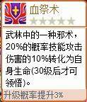 有20%的几率将技能伤害的10%转化为自身生命,30级后次啊可以领悟。