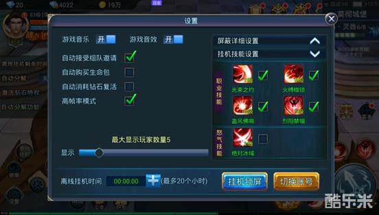 技能设置:界面显示玩家所有职业技能和键怒气技能,通过勾选选择挂机中要自动释放的技能。