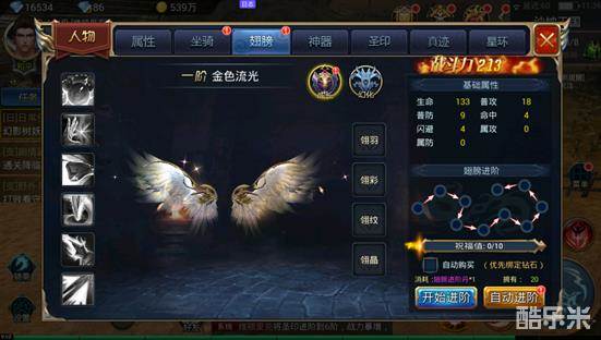 3.翅膀最高有19阶,每次一进阶成功都可以有更高的战斗力并且获得更酷炫的新造型。翅膀品阶达到指定阶数还能获得翅膀技能。