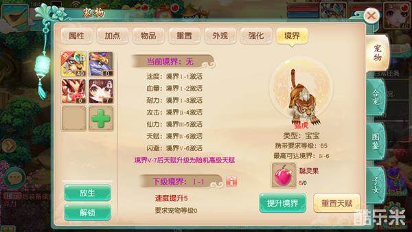 宠物境界是针对单一只宠物的属性加成系统,每个境界等级均可激活不同的效果!到达一定境界,即可激活宠物天赋!境界等级再往后可将激活的宠物天赋技能变成高级技能!宠物的天赋可以使用特定道具重置,不会被技能替换掉。
