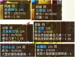 再次,剩下的技能、大型中型武器伤害,1级的内力才伤害加成1点,5级的加成5点,以此类推,10级的加成10点,对于占据大多数的非RMB玩家来说,10级我表示鸭梨山大。。。一般5级就差不多了,随着时间的积累会越来越多,但是这些加成在大型中型武器实践当中并不算多,而且帮派修炼里的技能武器加成已经很高了,在实践当中,一把大型中型武器打一下100以上的血,加成这么几点对于400、500多血的豆油来说,属于无关痛痒了。
