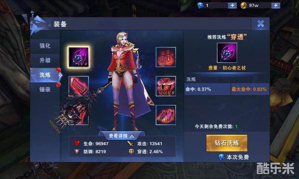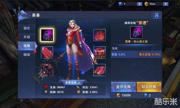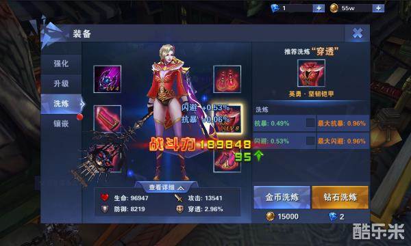 通过使用金币或钻石,我们可以将装备上已有的属性洗去,并换上新的属性,在众多的属性项目中,以穿透属性对战力的加成最大。