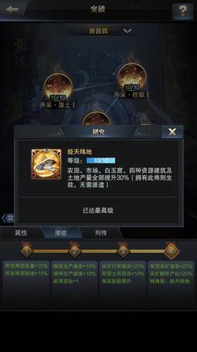 对于武将突破,主公们一定更关心其突破完成后所获取的特殊技能。张纮突破后获得的新技能【经天纬地】可以说是现在的种田神技!该技能的效果是:农田、市场、白玉窟、四种资源建筑及土地产量全部提升30%,而且无需武将派遣,只要拥有张纮即会生效。这是目前唯一一个被动提升白玉窟及城外四种资源建筑产量的武将,可以大大提升生产白玉的速度!无论是对于喜爱种田经营的休闲玩家,还是需要收集资源攻城略地的重度玩家来说,张纮绝对是资源产出必备武将!