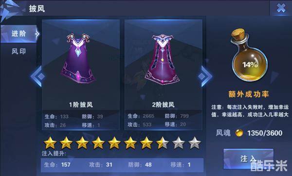 一开始可能小伙伴们会觉得这披风好难看,没有什么特别,但是越是升级,慢慢的就会发现披风越发的酷炫。但是到了后期,披风的升级就变得非常难,不仅每次升级所需要的风魂数量变得越多,进阶时的披风进阶石也需要的更多了。而且,披风的升级不是百分百会成功的,就如上图右侧所提示的,是有概率性的,这就要看小伙伴们的运气了。