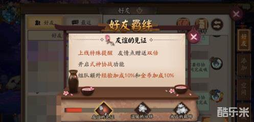 1、首先,羁绊值可以通过组队,点赞,送心,邀请百鬼,赠送福袋等方式增加,如果在同一个阴阳寮,还可以赠送碎片