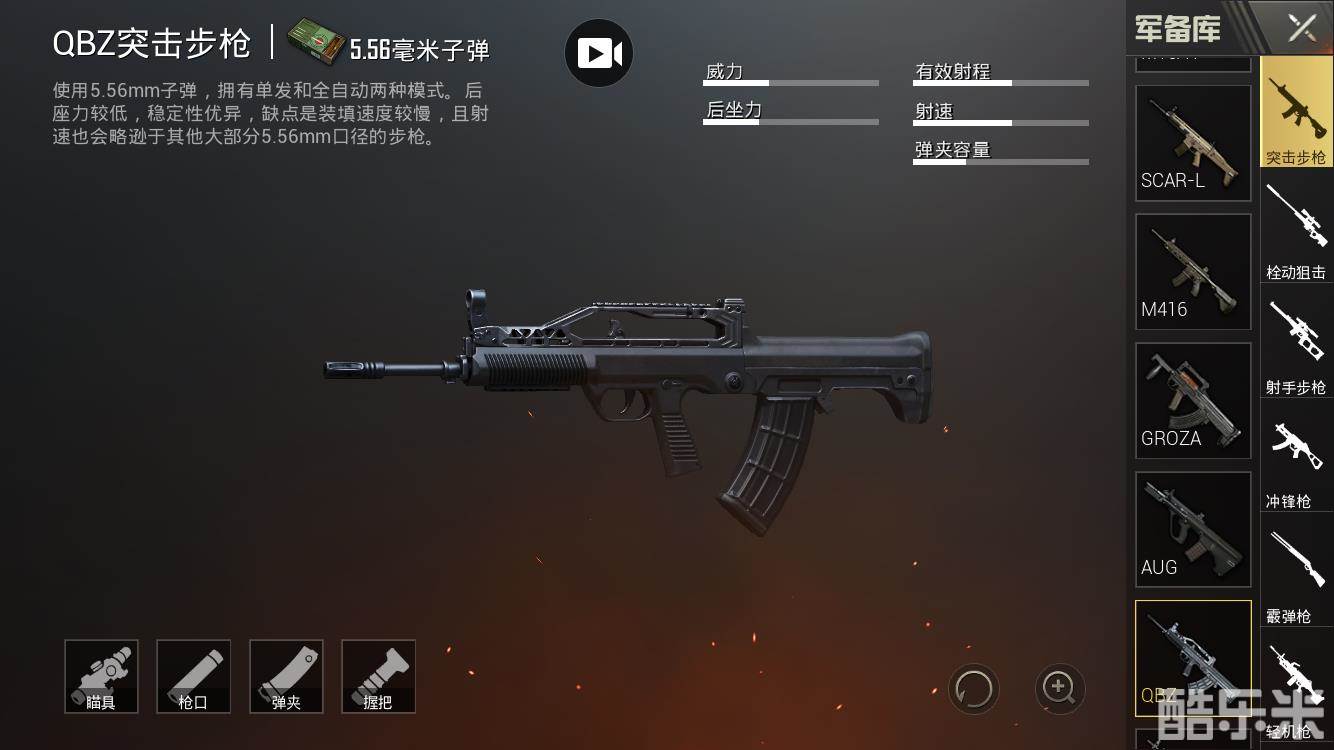 从属性方面而言,如果你需要一把极具个性的步枪武器,除了AKM之外就剩下了一把QBZ了!它虽然射速略差于其他同类武器,但弹道稳定性以及前期不需要加装配件就能轻松驾驭的可控性同样是其他同类武器望尘莫及的。