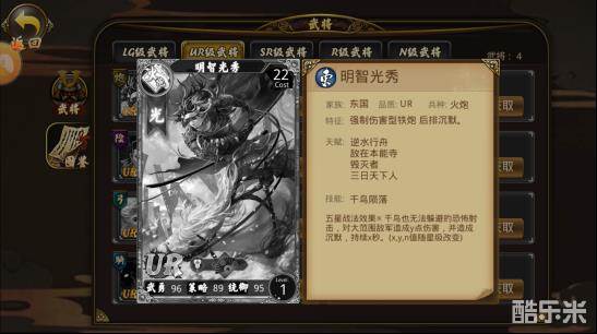 【明智光秀】:范围沉默非常6,我觉得是一个战略神将~弱化版益达,百分比掉血的天赋和群体暴击光环让输出非常恐怖,可惜这个版本铁炮被削弱了,不然明智绝对能提高一个档次~;