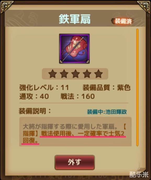 由于池田辉政的技能为BUFF类,所以攻击主要依靠普攻,所以比较推荐能够提高普攻和攻速的装备。其核心装备为[铁军扇(入手方法后述)],作用为使用技能后一定几率回复2点士气,正好能够抵消掉池田辉政的技能消耗。