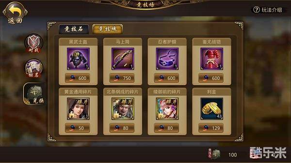 每次胜利,玩家都获得铜钱,竞技石,竞技魂作为奖励。竞技石与竞技魂可在兑换商店处兑换铜钱,兵粮,判金,武将碎片等各种资源。