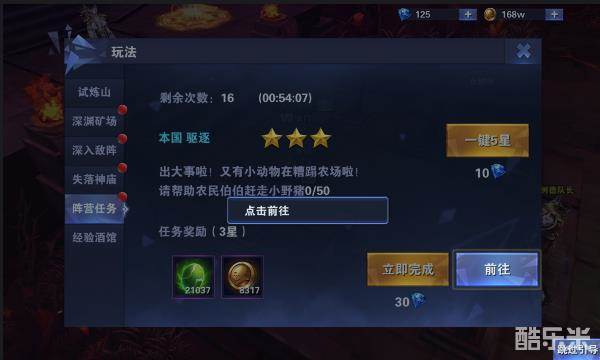 阵营任务多数可以通过清除小怪或者采集道具之类的方式完成,大家可以点击“前往”按钮,开启全程自动模式完成。如果你的VIP等级达到了2级,也可以通过点击“立即完成”按钮,花费一定钻石立刻完成任务。在任务完成之前,大家可以随时点击“一键五星”按钮将底星级任务升到五星,从而获得最高奖励。