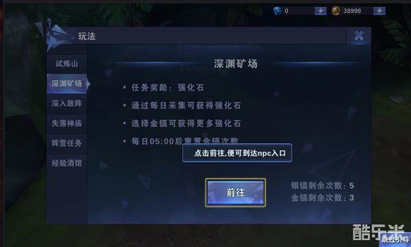 当玩家到达16级后就可以开启挖矿玩法。在游戏界面中打开玩法界面,选择深渊矿场并点击前往,便可自动寻路到矿场看守工。