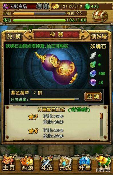 神器的升级速度固定化,使我们可以轻松计算出神器升级所需经验的准确数据。方法很简单,攒一两百石头,截升级前和升级后的图。具体的方法,大家讲究往下看吧。用任意一款能在图上加文字的软件,就这两张图上加11个 丨(shu),这11个丨放在神器进度条上,头尾两个丨分别在进度条的两边。这样就可以人为的把神器进度条分成十个相同的进度条,从而清楚的测量升级所需的经验。