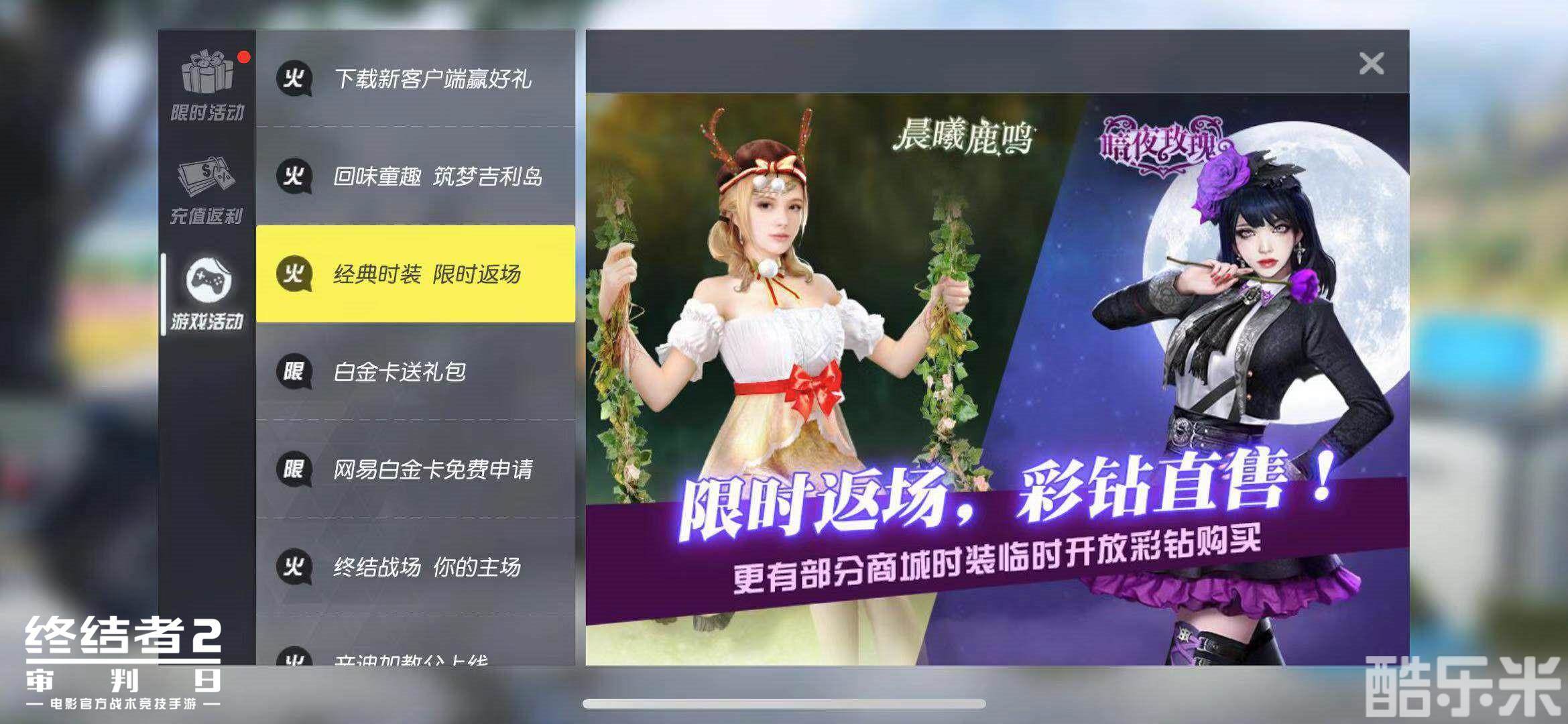 绝版时装限时返场,曾备受追捧的暗夜玫瑰和晨曦鹿鸣两套绝版时装将限时返场,而且只需使用彩钻即可购买,更多玩家有机会体验到绝版时装的别样魅力。部分商城精选道具也将开启限时彩钻购买渠道,还有AKM地狱火(7天)、纯白天使(7天)等热门时装和皮肤,仅需花费少量金币、彩钻即可获取!