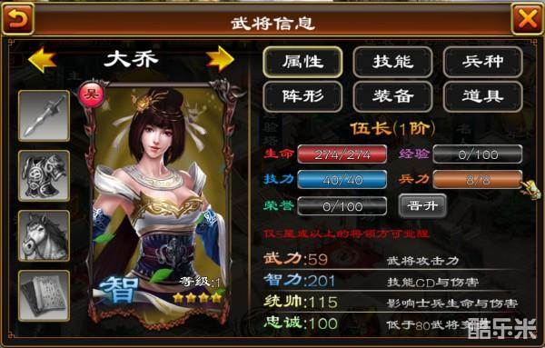 再来看看小乔的姐姐——大乔。大乔也是全攻击技能的武将,也很适合新手玩家前期培养。大乔的基础属性比小乔稍稍高一点(毕竟是姐姐嘛→_→)。技能上,大乔的三个攻击技能分别是火烧敌方、发射箭雨和召唤火柱。军事技的话是开局前损失一般兵力,但是武力、智力和统帅生命都会大幅上升。这个军事技可以说是有利有弊吧,玩家要根据实际情况来取舍,如果双方兵力相差太多,使用技能可能会舍得其反。