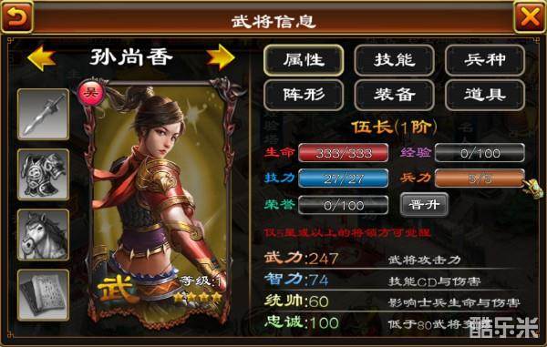 前面说了两个智将,我们再来看一个武将吧!孙尚香作为妹子,武力处于中上水平。前期如果没有遇到好的武将,培养孙尚香也不错。孙尚香的前两个技能是攻击技能,分别是召唤冰凌和发射阵雨。第三个技能是召唤八卦阵,使阵内地方致盲。一秒弄瞎对手后,敌方命中就会大大降低,所以还是挺有用的。军师技跟小乔一样,也是己方所有技力小幅上升。