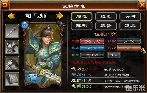 最后我们来看一个魏国小鲜肉——司马师。出属性看司马师和大乔差不多。技能上司马师也是三个攻击技能,召唤牛、陨石和闪电,军师技和和大乔一样。其实司马师和大乔差不多,玩家选择一个来培养就可以了。颜值上来说,大乔是吴国大美人大家都知道了,不过司马师作为魏国小鲜肉颜值也是很高的。所以妹子可以选择司马师,汉子选择大乔。毕竟是前期使用,中后期都要换五星,差不多就可以了。