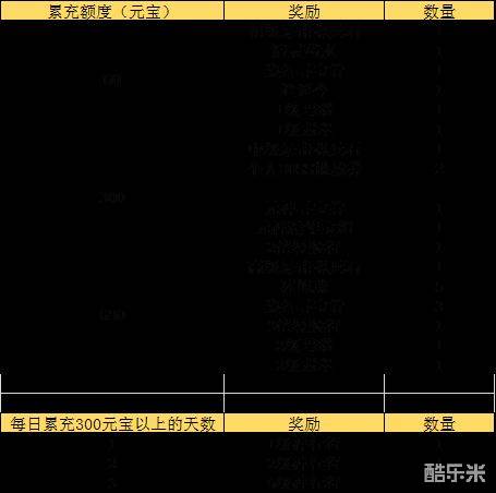 活动说明:每日累计充值即可领取奖励,活动每日重置。同时当天累充300元宝以上,计算一次累充天数,可以领取对应天数奖励