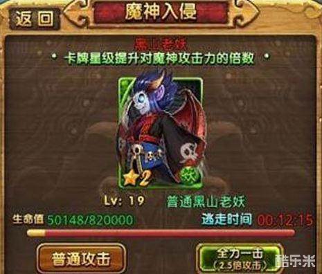 天天爱西游黑山老妖是游戏中第一个见到的魔神,在玩家才刚开始的时候就能够碰到他。这里也是玩家第一个需要为之卡级的地方,也就是为什么玩家会选择卡在49级不升级的原因,魔神在游戏中的很总要性是不言而喻的,可以说没有魔神,你会更加的举步维艰,到后面连图都过不了,自身实力上不去啥都不行了。